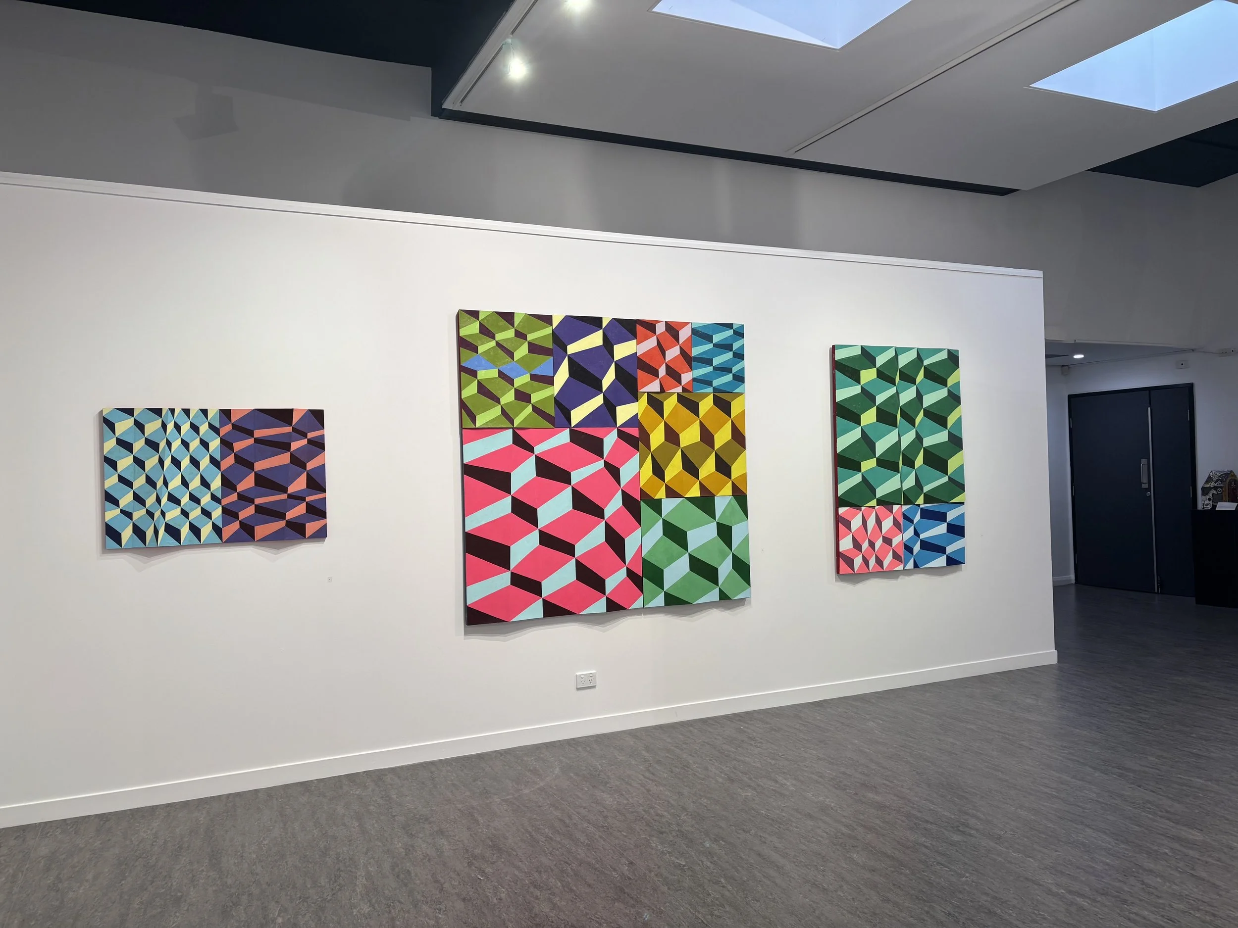 Quiltwork 2.1_2024-2025, acrylic paint on 7 birch panels with constructed box board relief, overall dimensions 150 x 160 x 7cm